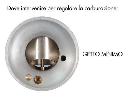 Il principio di funzionamento di tutti i carburatori si rifà ad un principio fisico preciso: è la risposta del sistema ad una depressione generata dall’azione aspirante del motore. Quando la valvola del gas è chiusa, o quasi, la depressione che insiste sullo spruzzatore principale non è sufficiente a richiamare carburante dalla vaschetta. E’ per questo che il carburatore ha un secondo circuito di erogazione che entra in funzione con questo tipo di condizioni (di MINIMO) in modo da garantire il funzionamento del motore che altrimenti si spegnerebbe. La caratteristica del circuito del minimo è quella di avere il foro di erogazione in un punto che, con la valvola del gas chiusa, è di forte depressione e quindi in condizioni ottimali per erogare carburante dalla vaschetta. E’ fornito di un proprio getto (del MINIMO) la cui scelta è molto importante non solo per poter lavorare in condizioni di minimo ma anche per ottenere la migliore risposta del motore durante la prima apertura della valvola del gas, che successivamente andrà a caratterizzare la successiva progressione. Se si installa un getto troppo grande il motore faticherà a restare acceso ed avrà un accelerazione lenta. Se il getto del minimo è troppo piccolo risponderà meglio all’accelerazione ma quando si chiude il gas il motore resterà accelerato per qualche secondo per poi stabilizzarsi al minimo.